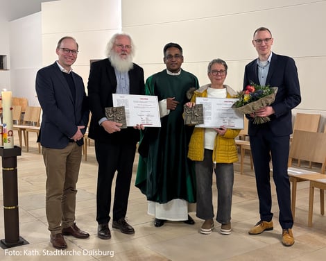 Das Foto zeigt v. l. n. r. Sebastian Geßmann, Dr. Karl-Heinz Junior, Pfarrer Dr. Joseph Puthoor, Barbara Ozimina, Daniel Wörmann